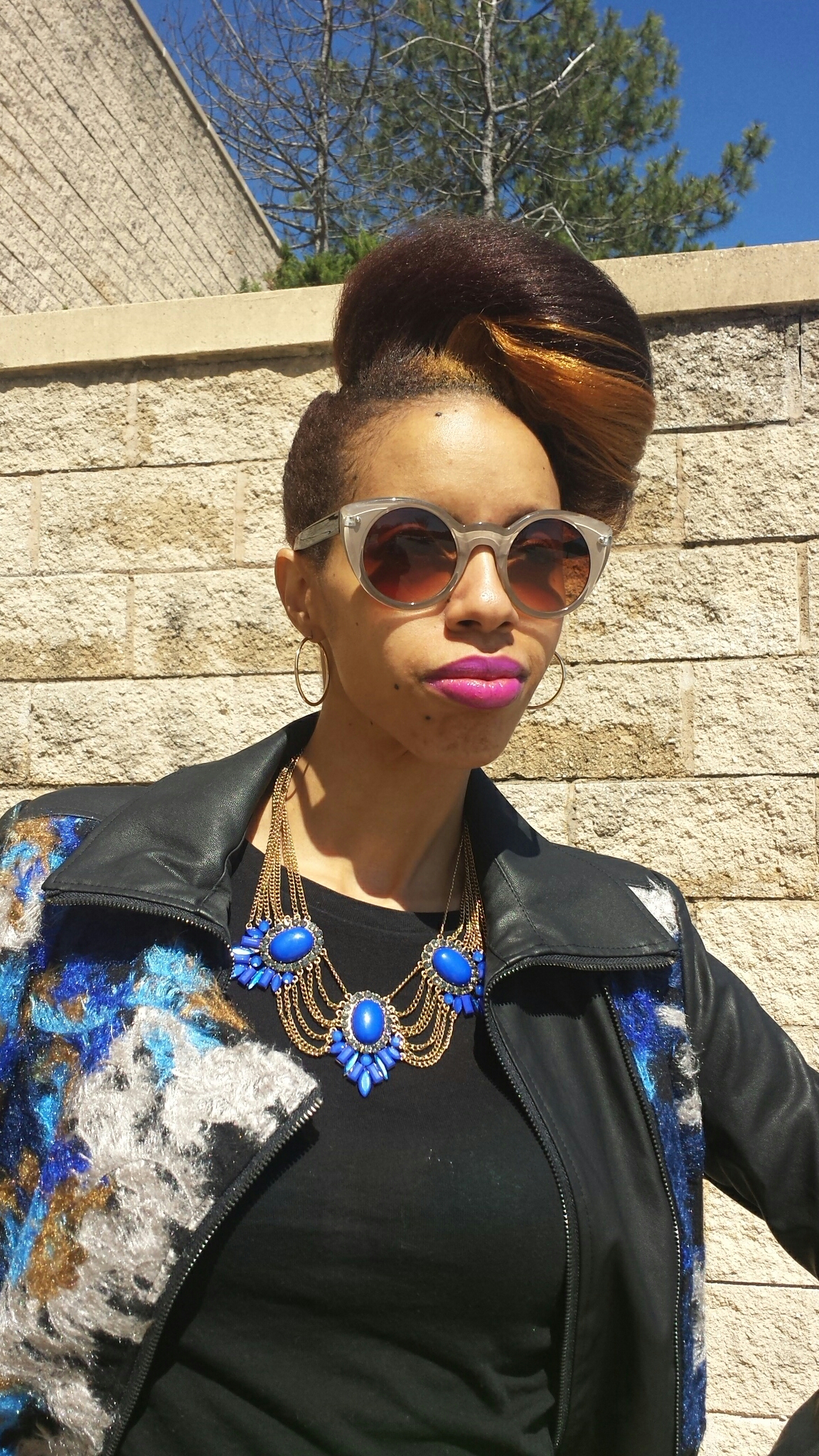 Sunglasses: Thrifted. Necklace: Francesca’s. Shirt: H&M. Jacket | Skirt: Primrose Boutique. Shoes : Shoedazzle.