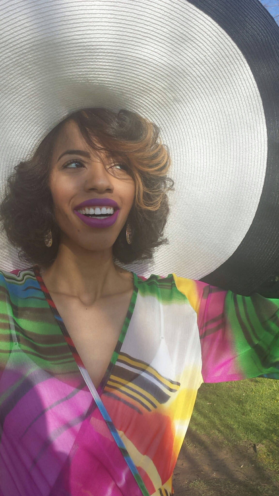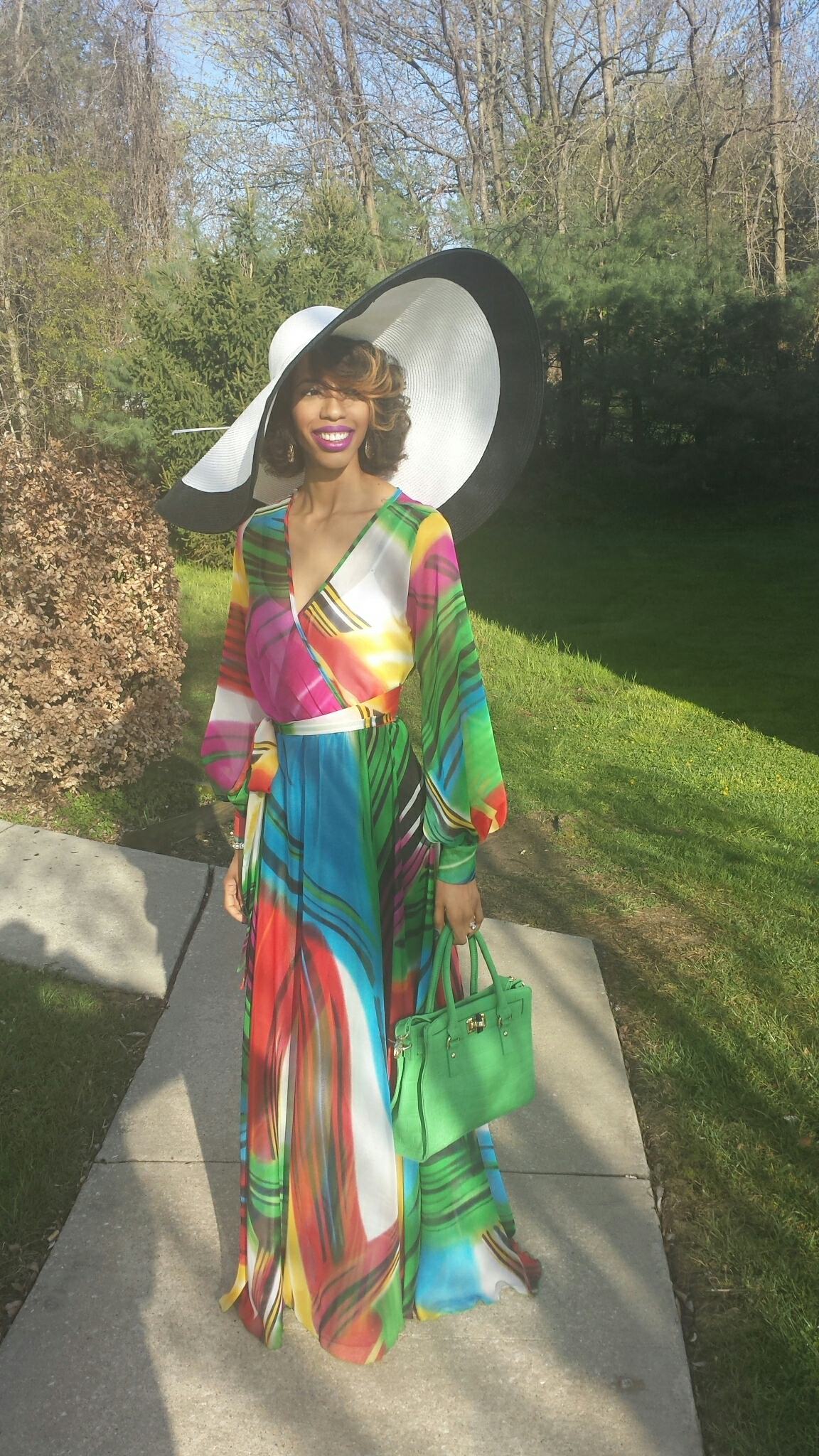 Dress & purse: LKGE Boutique. Hat: Marjae Hats in Westminster. Lip Color: “Royale” by Sara Sara Cosmetics.
