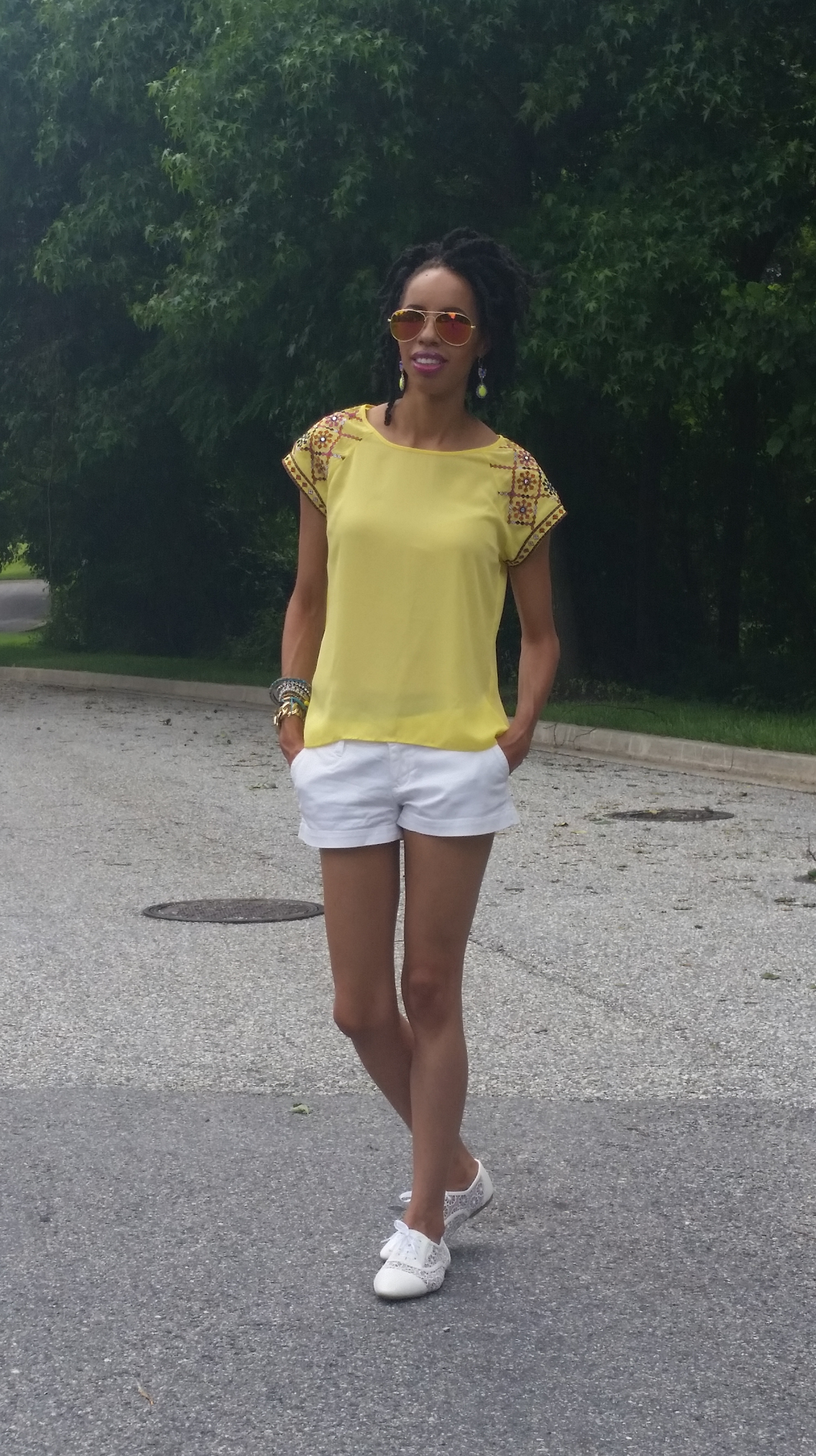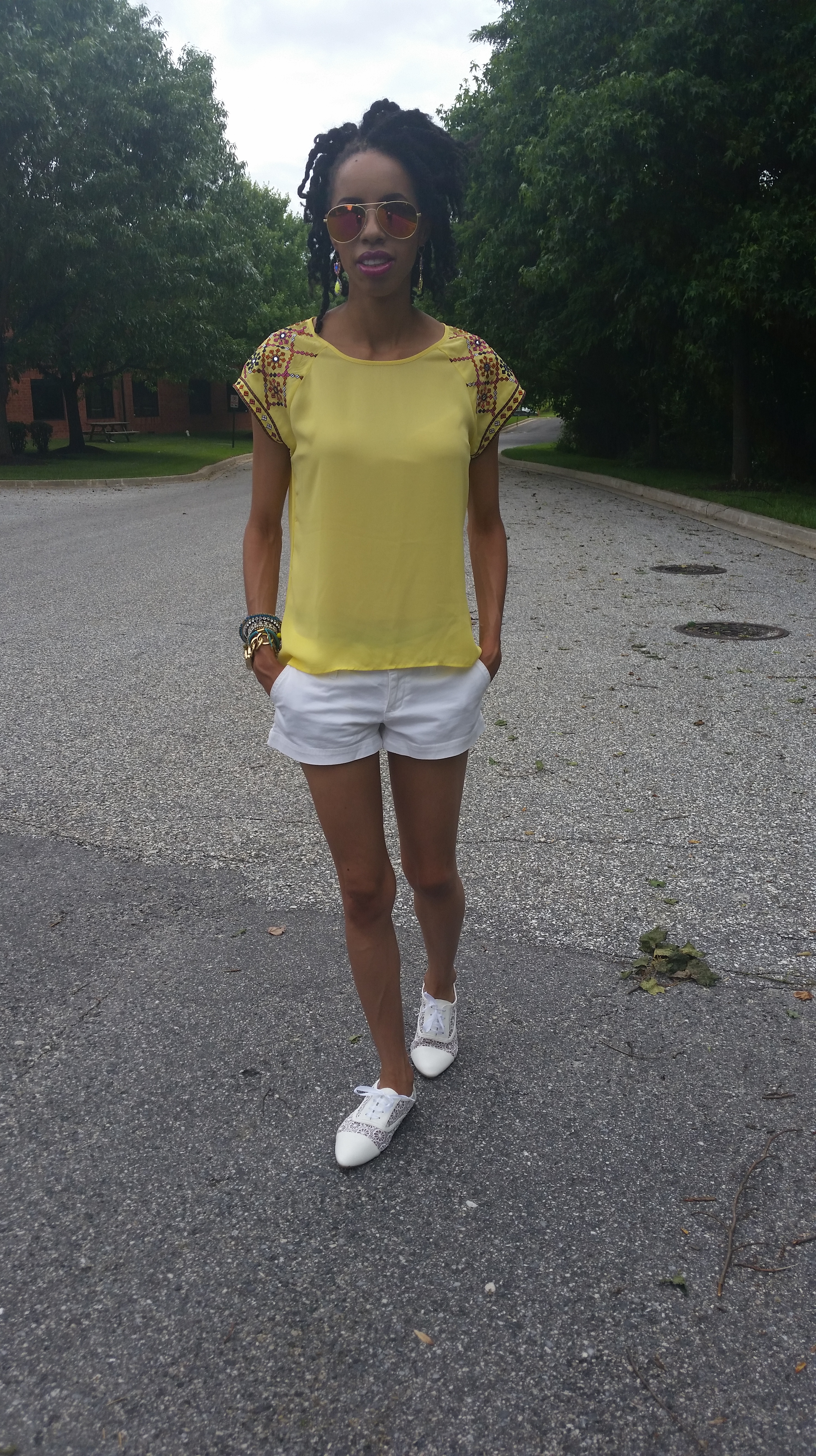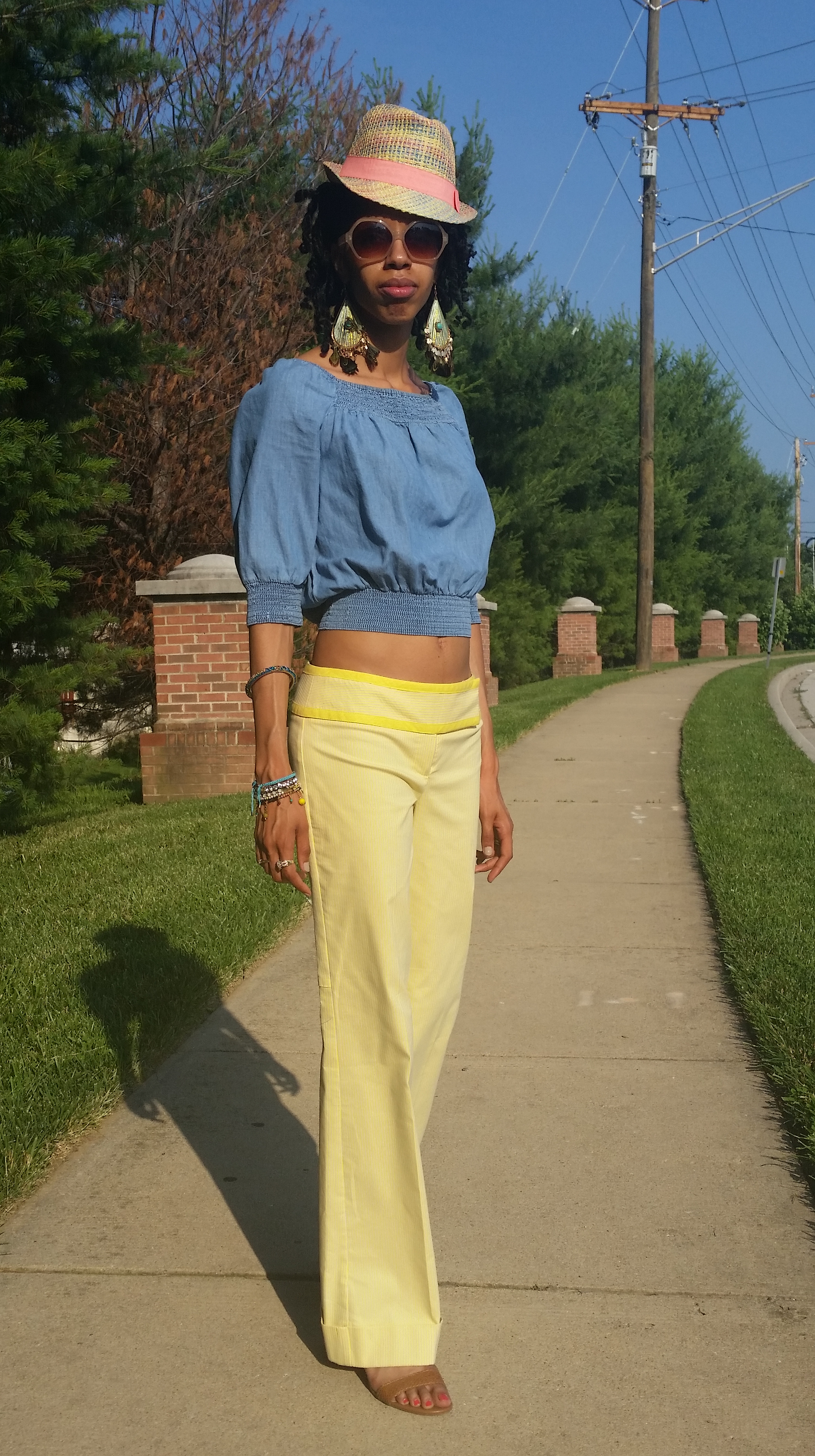 Embellished sleeve top & earrings: Francesca’s. White lace shoes: Victoria’s Shoe Palace. Hat: thrifted. Pants: Wear It’s At Consignment Boutique.