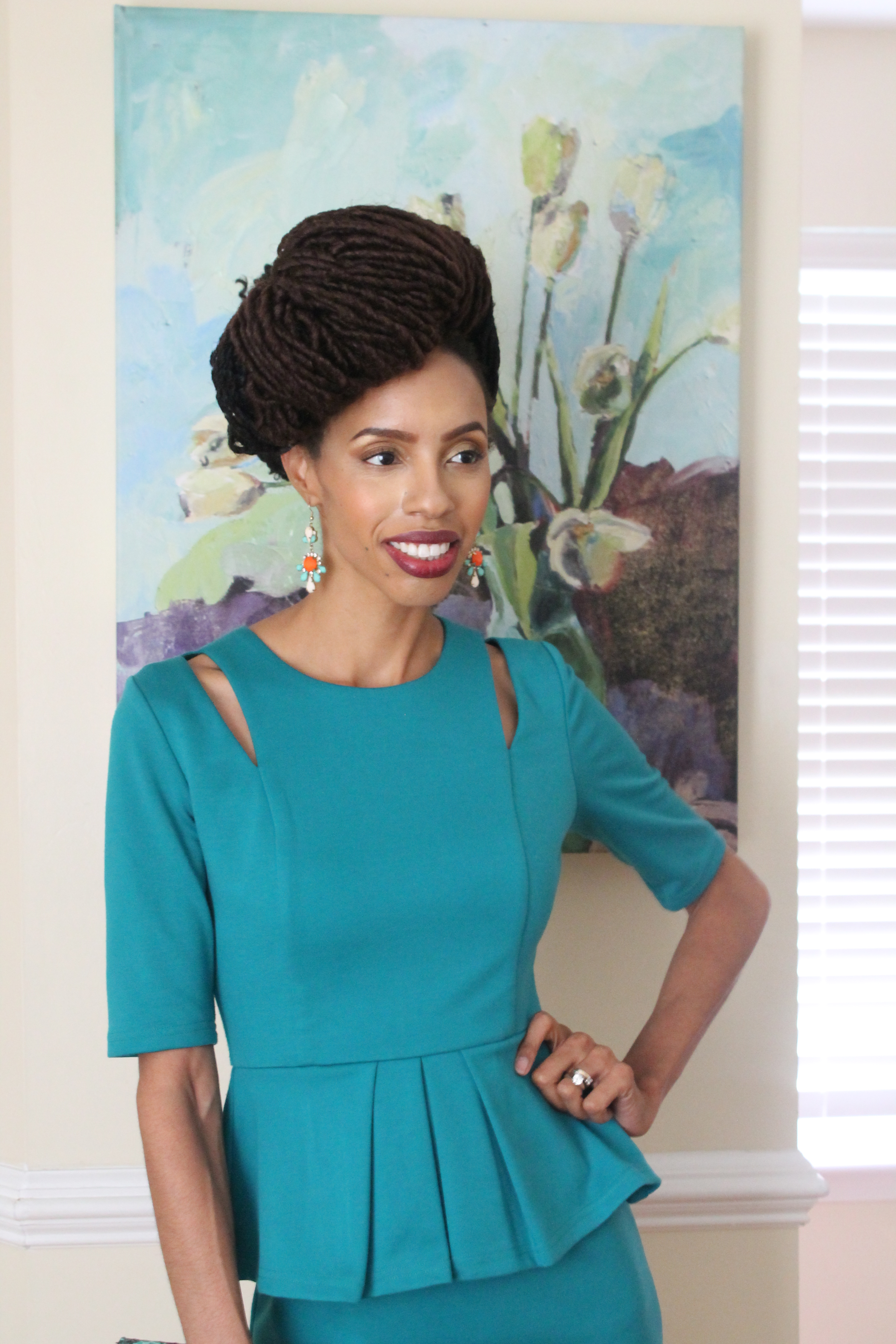 Dress: Primrose Boutiq. Shoes: Shoedazzle. Earrings: Francesca’s. Clutch: J.C.Penney’s, the Duro Olowu Collection. Watch: Michael Kors. Hair: ZarahCharm.com.