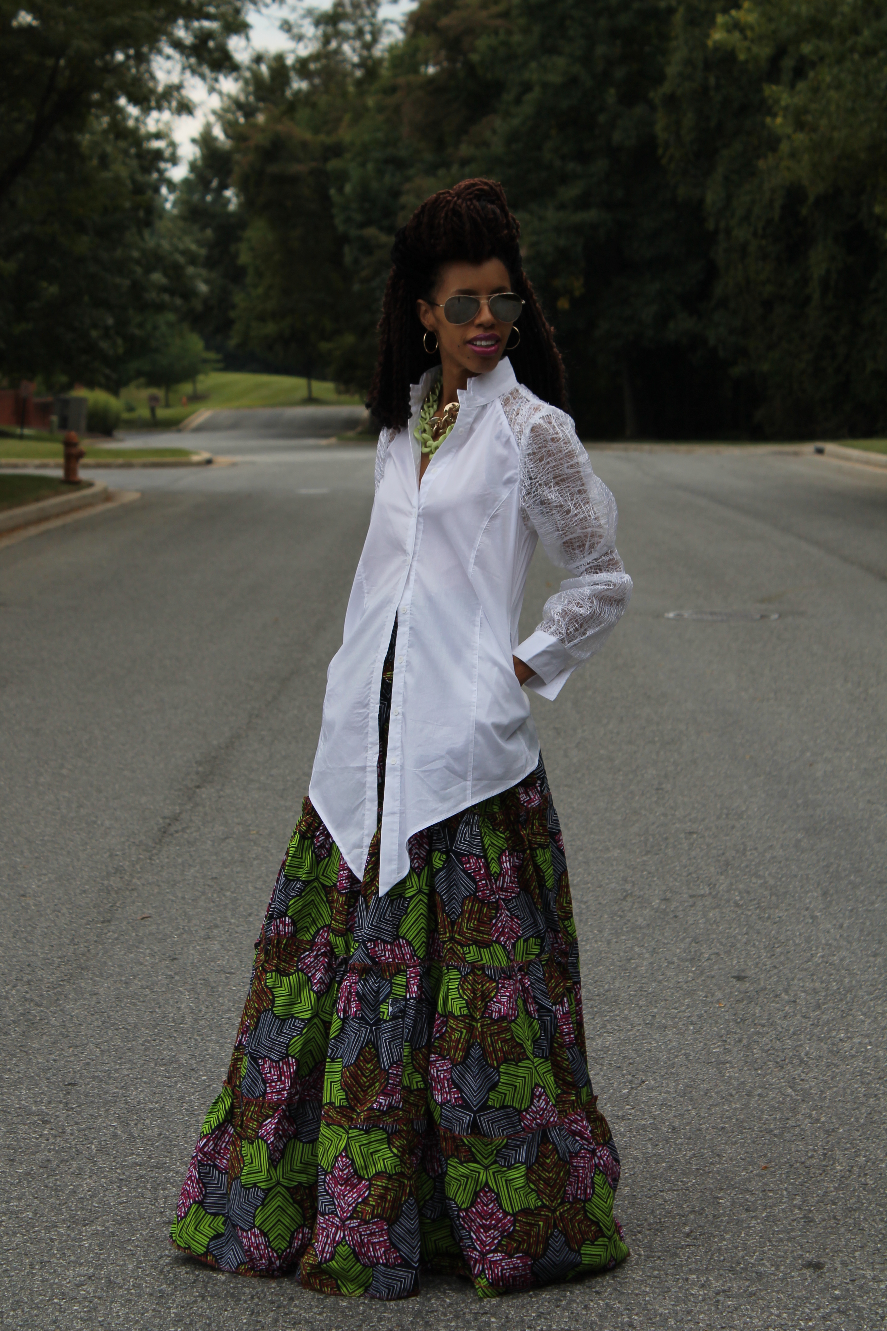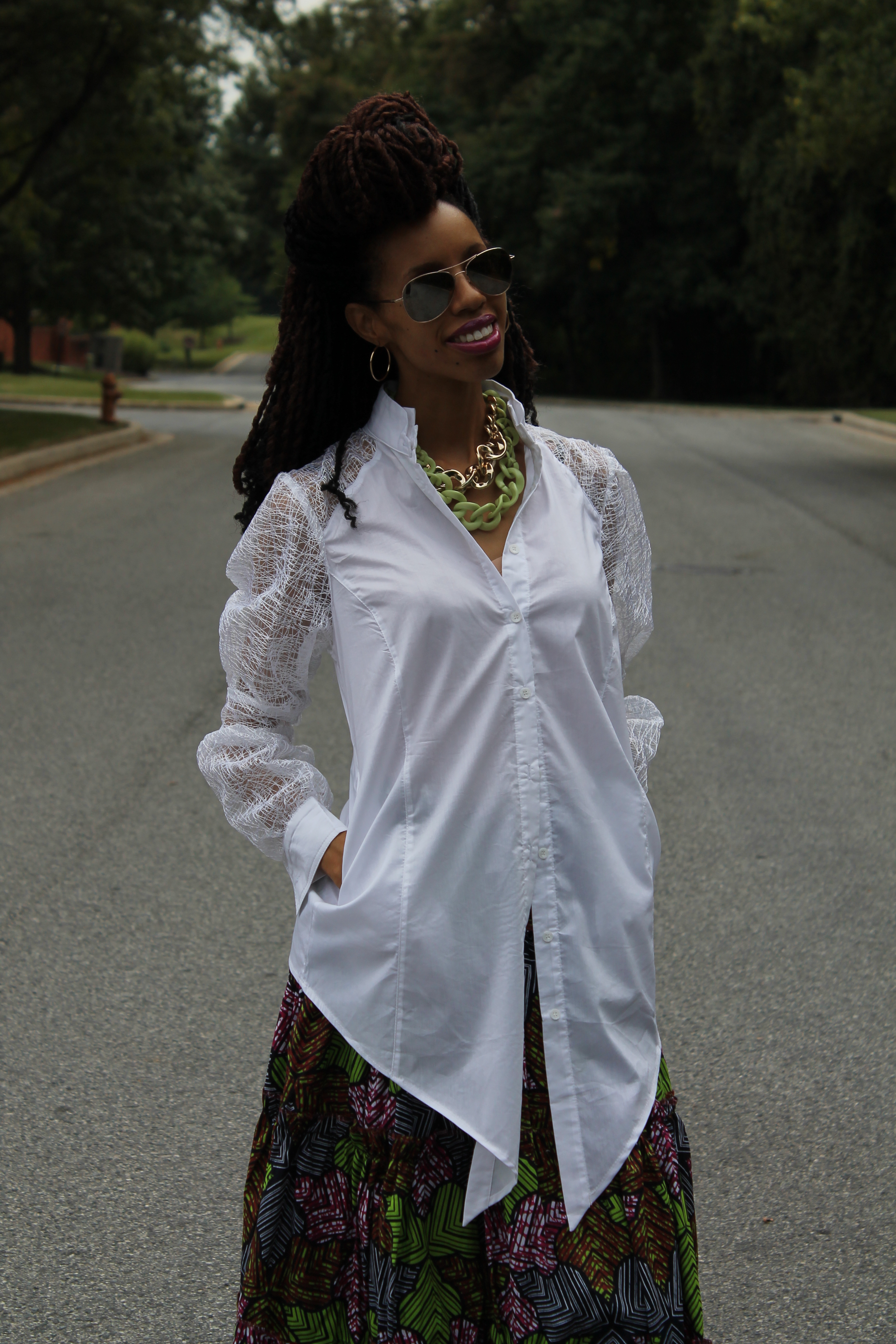 I have always admired African print fabrics. I was too excited to get my own Ankara skirt. This skirt was created as a dress by Miss Beida from Canada! Check out her Etsy page for more of her work! 🙂 I am also in love with this top from Primrose Boutique. This was a great shift from summer to fall in my wardrobe. Stay tuned for more fall fashions!