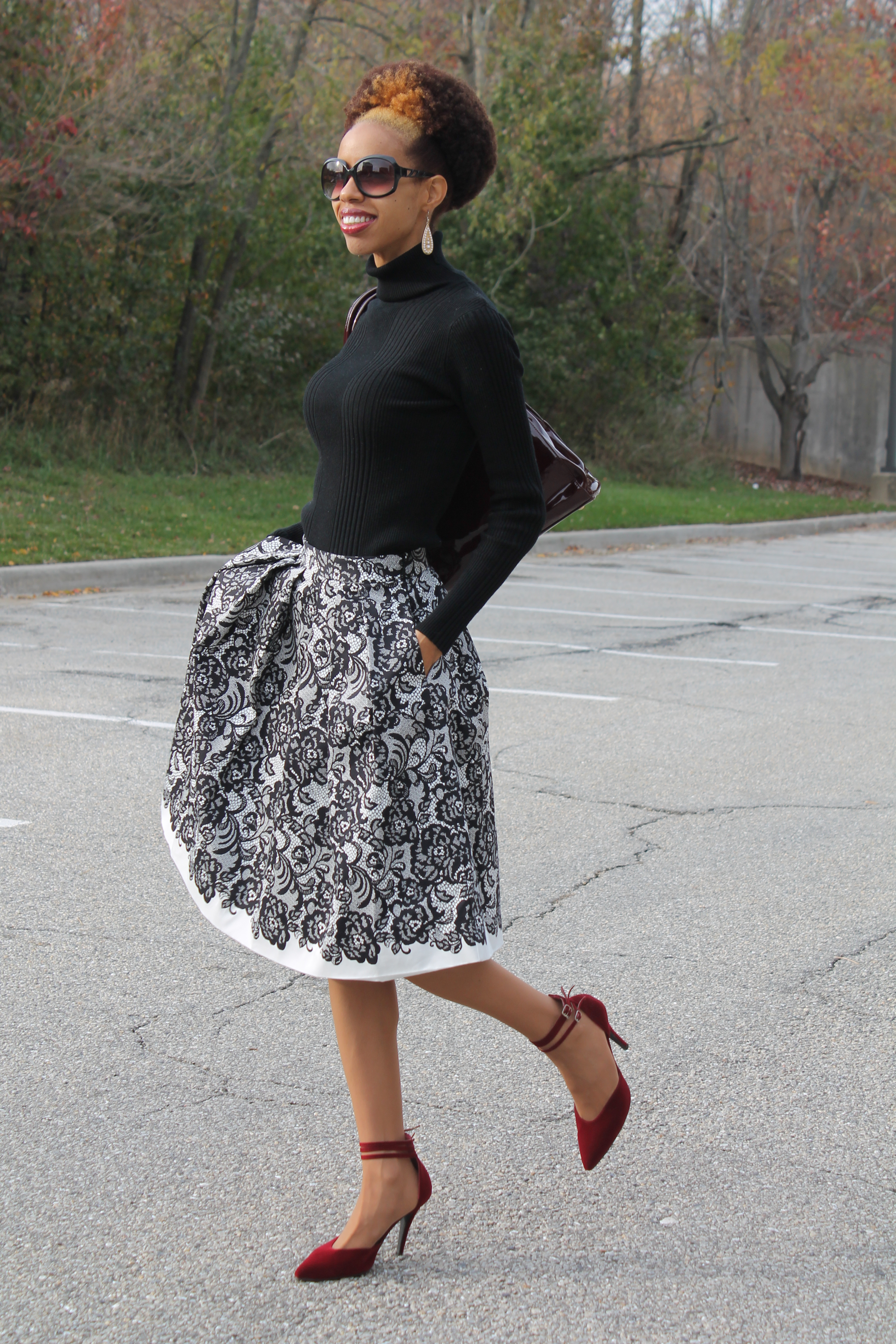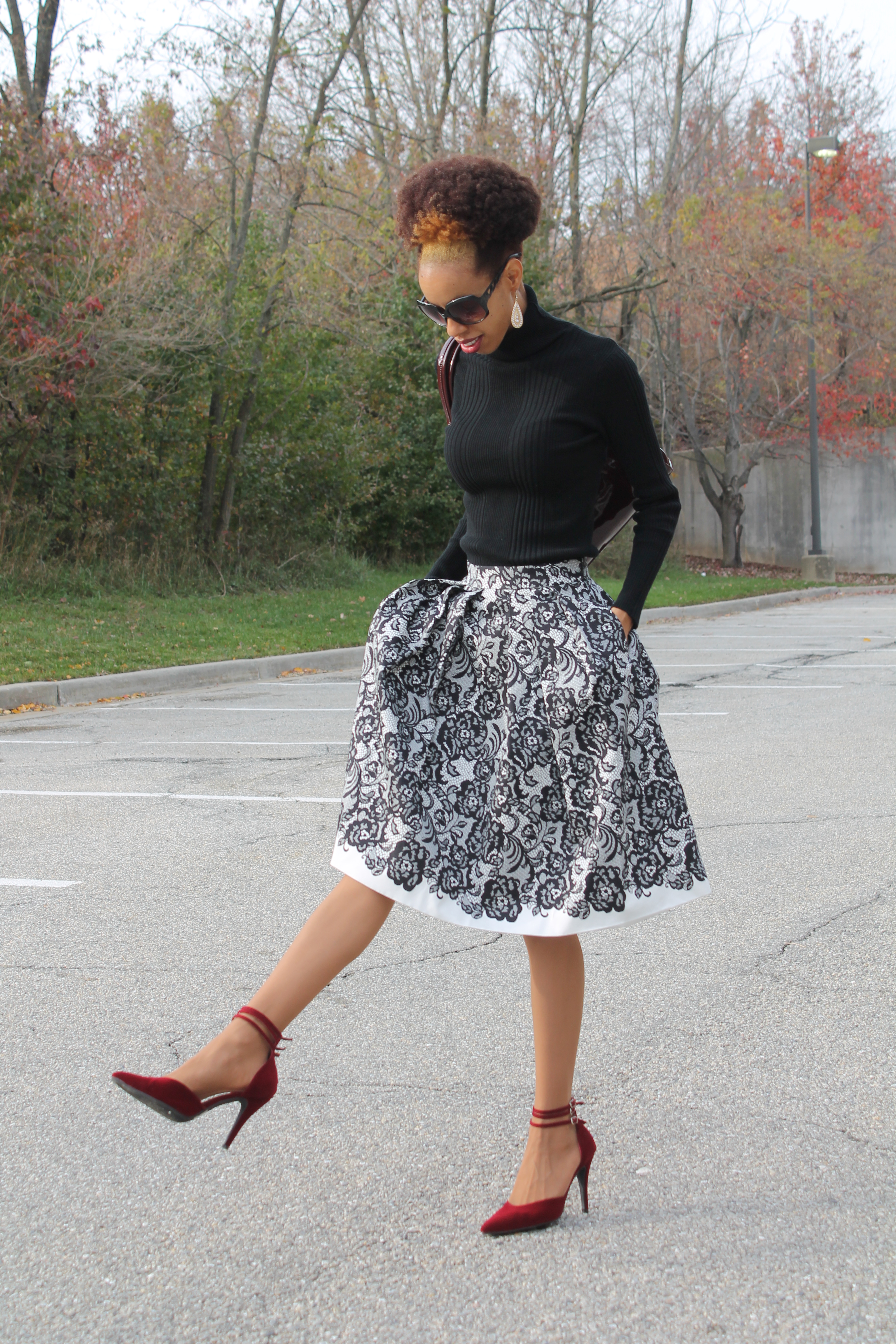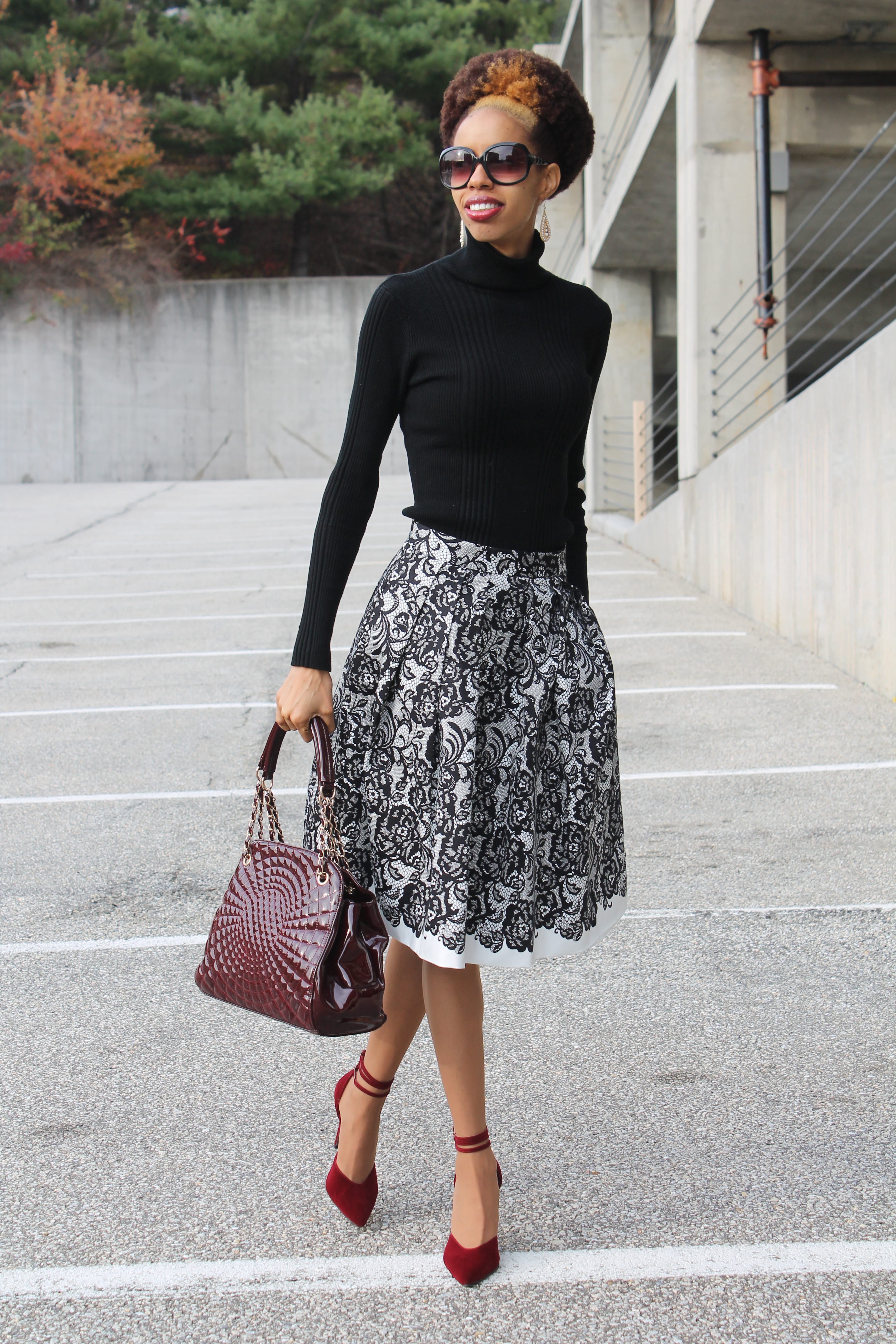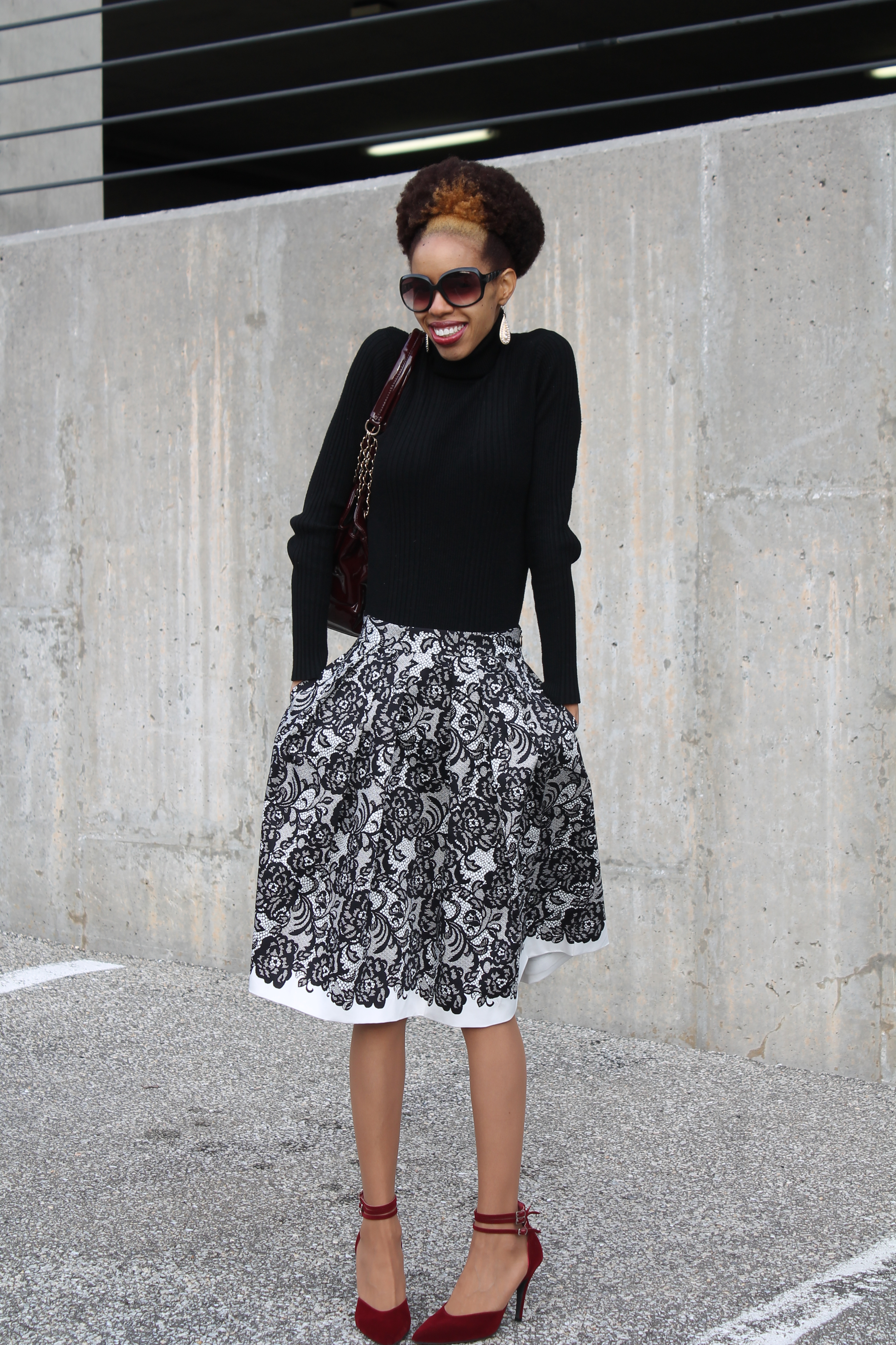 Loving the monochrome with the pop of red! Your skirt is so ornately beautiful 🙂
