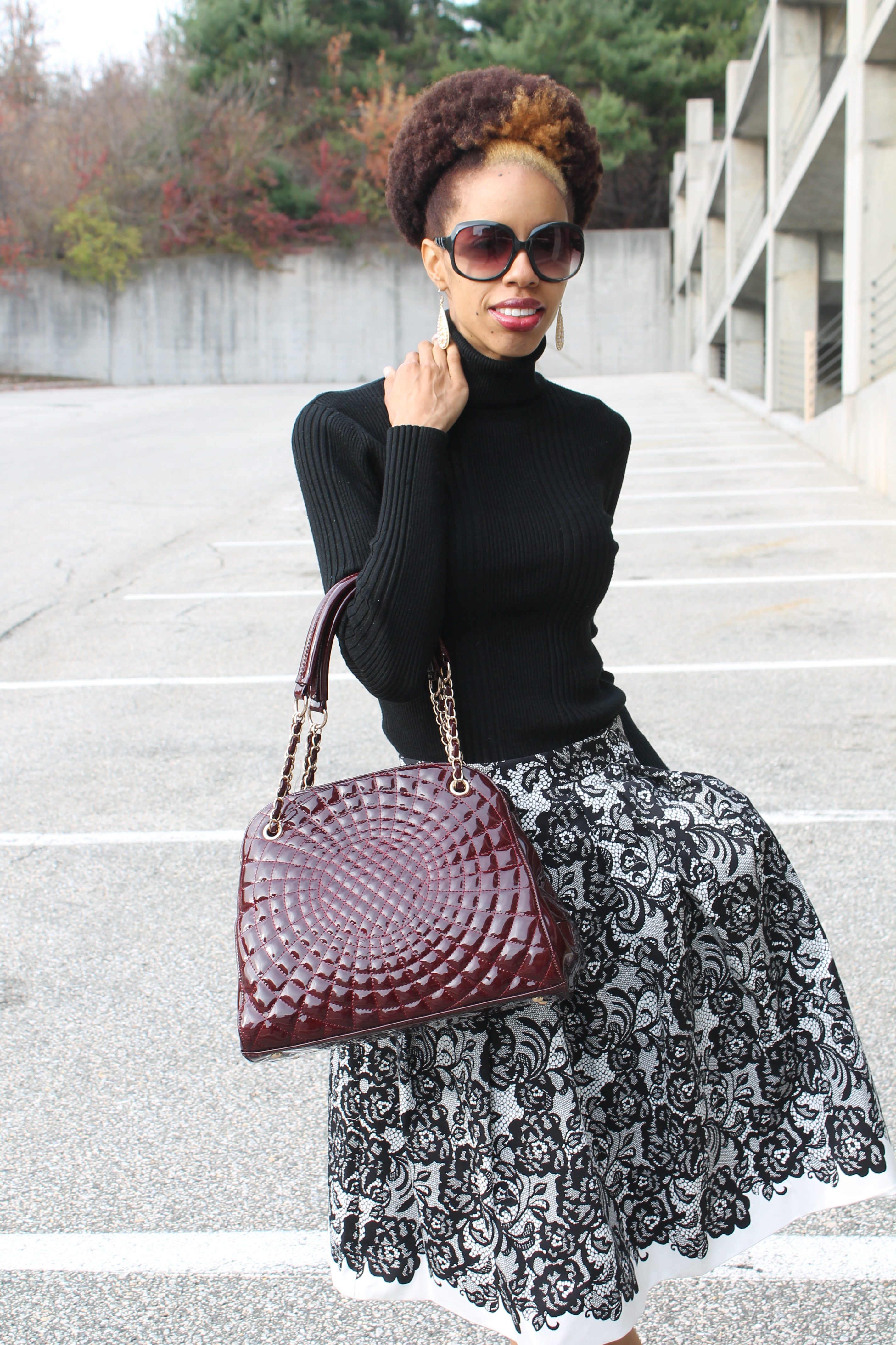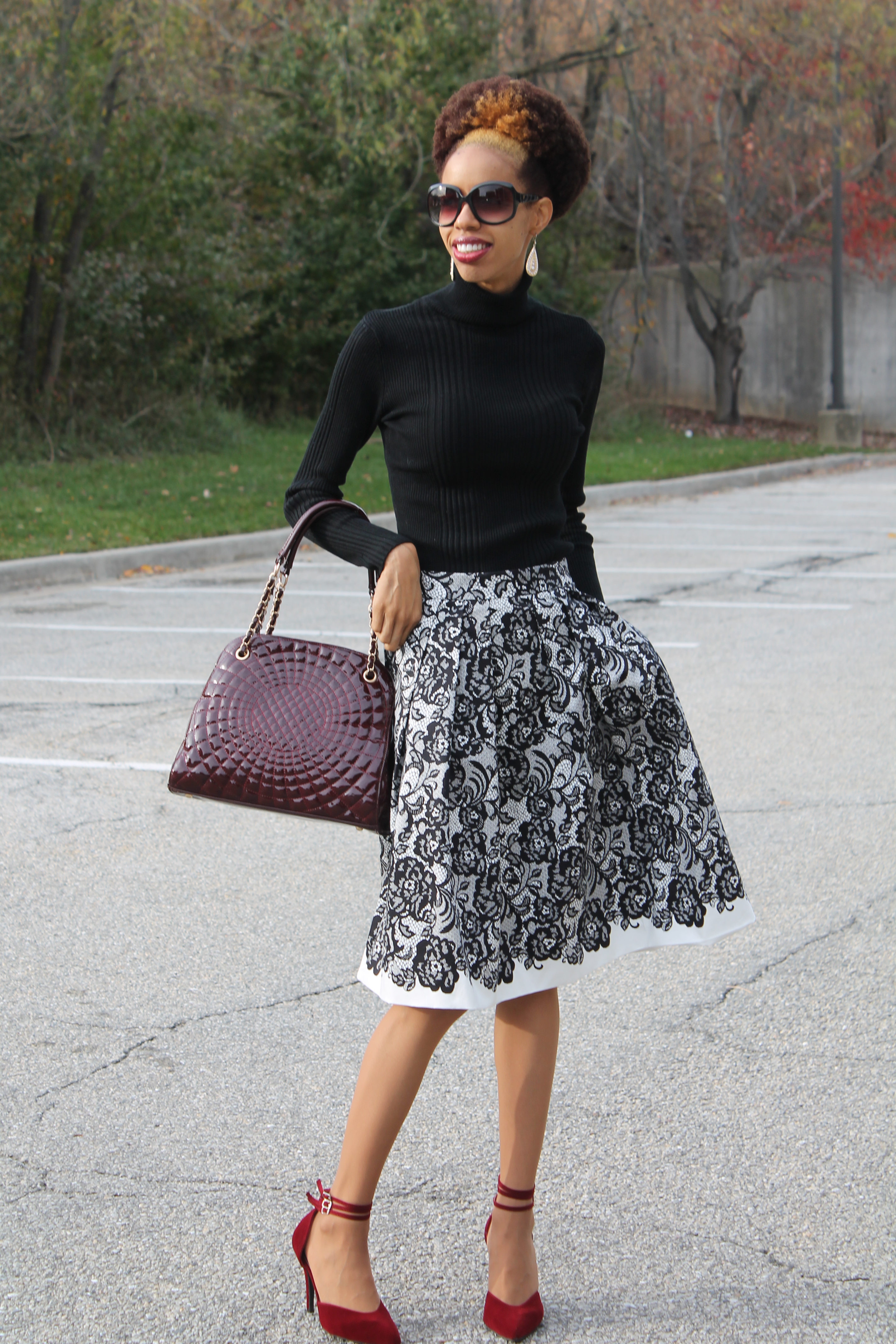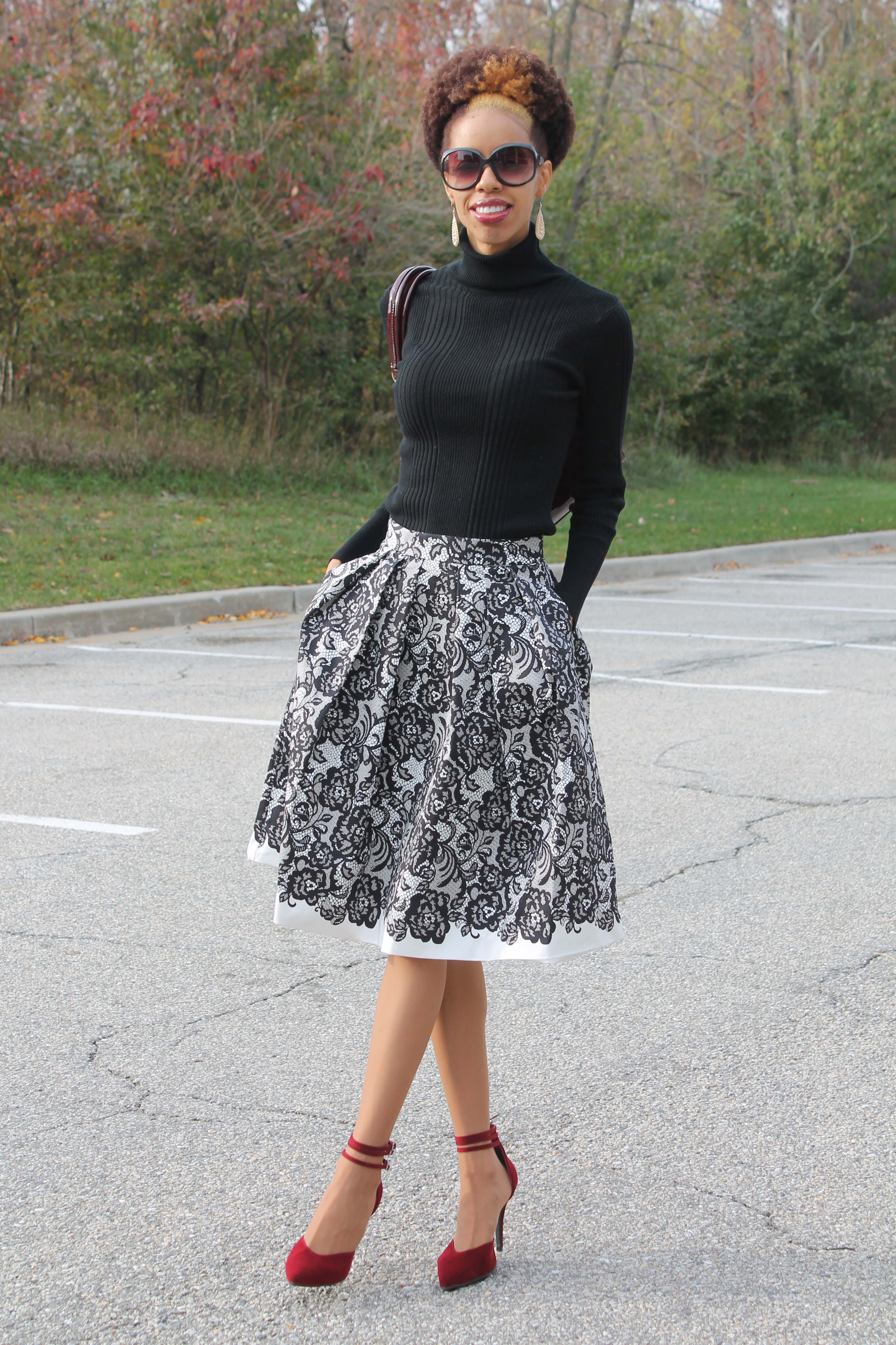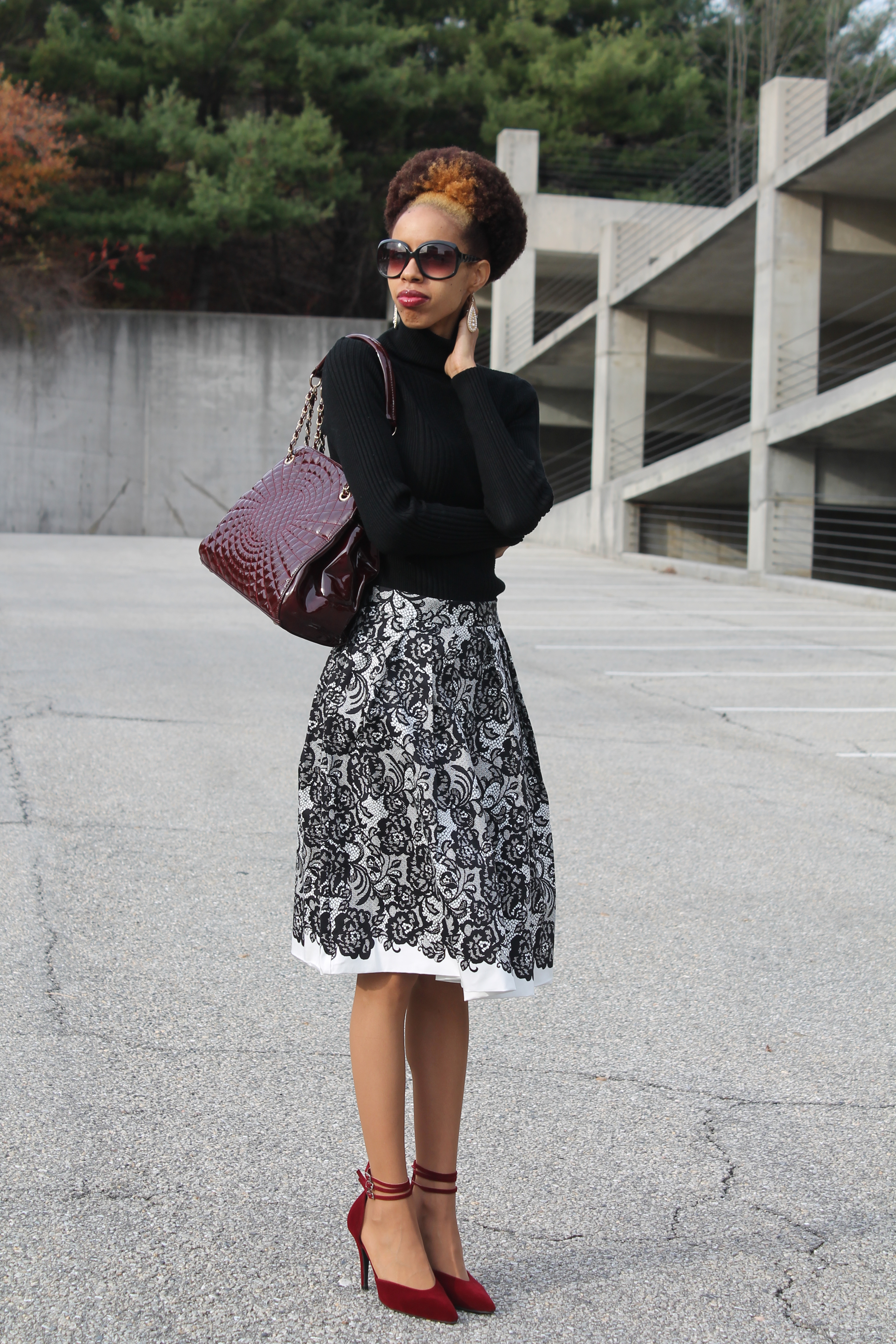 Loving the monochrome with the pop of red! Your skirt is so ornately beautiful 🙂