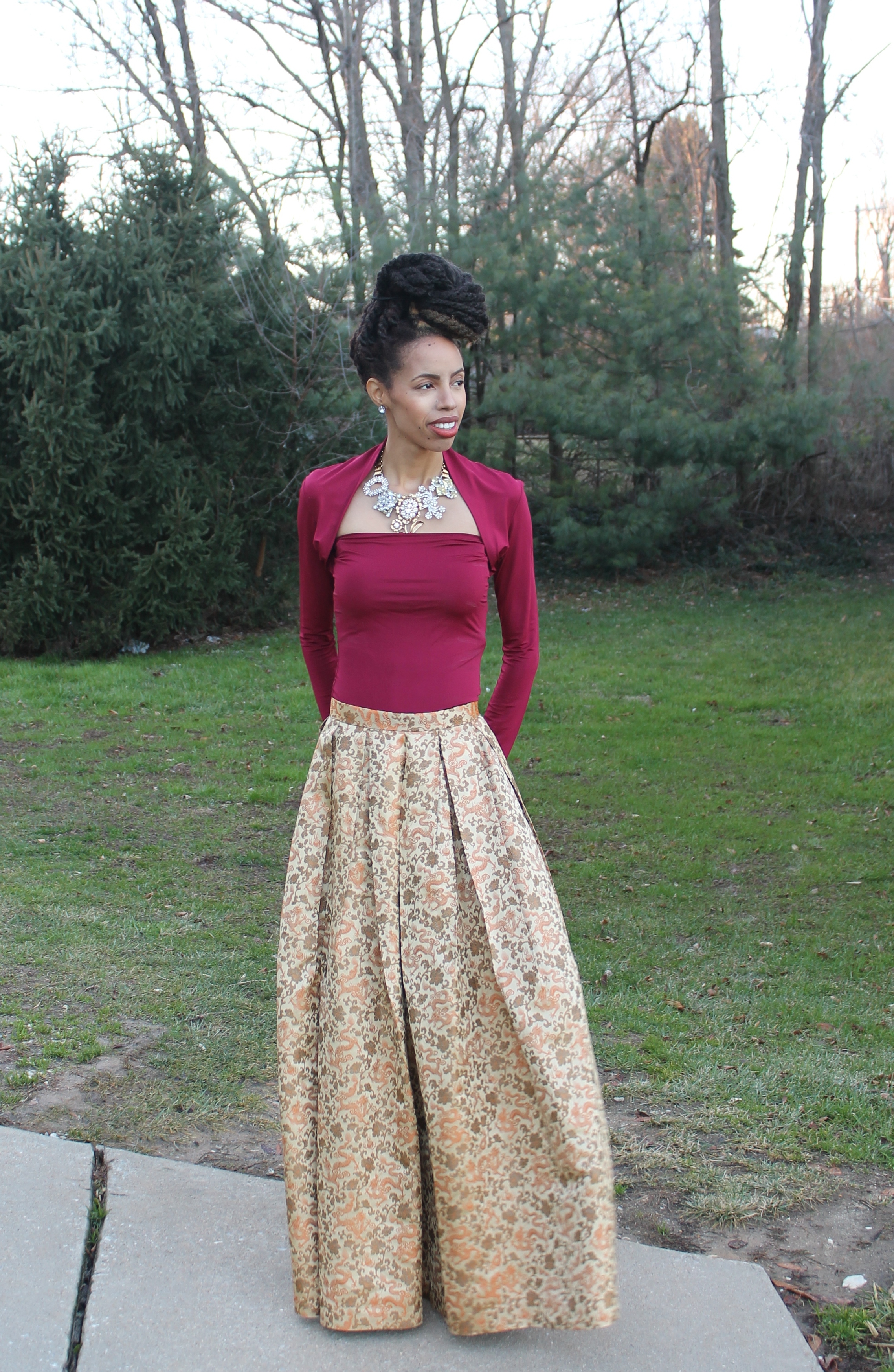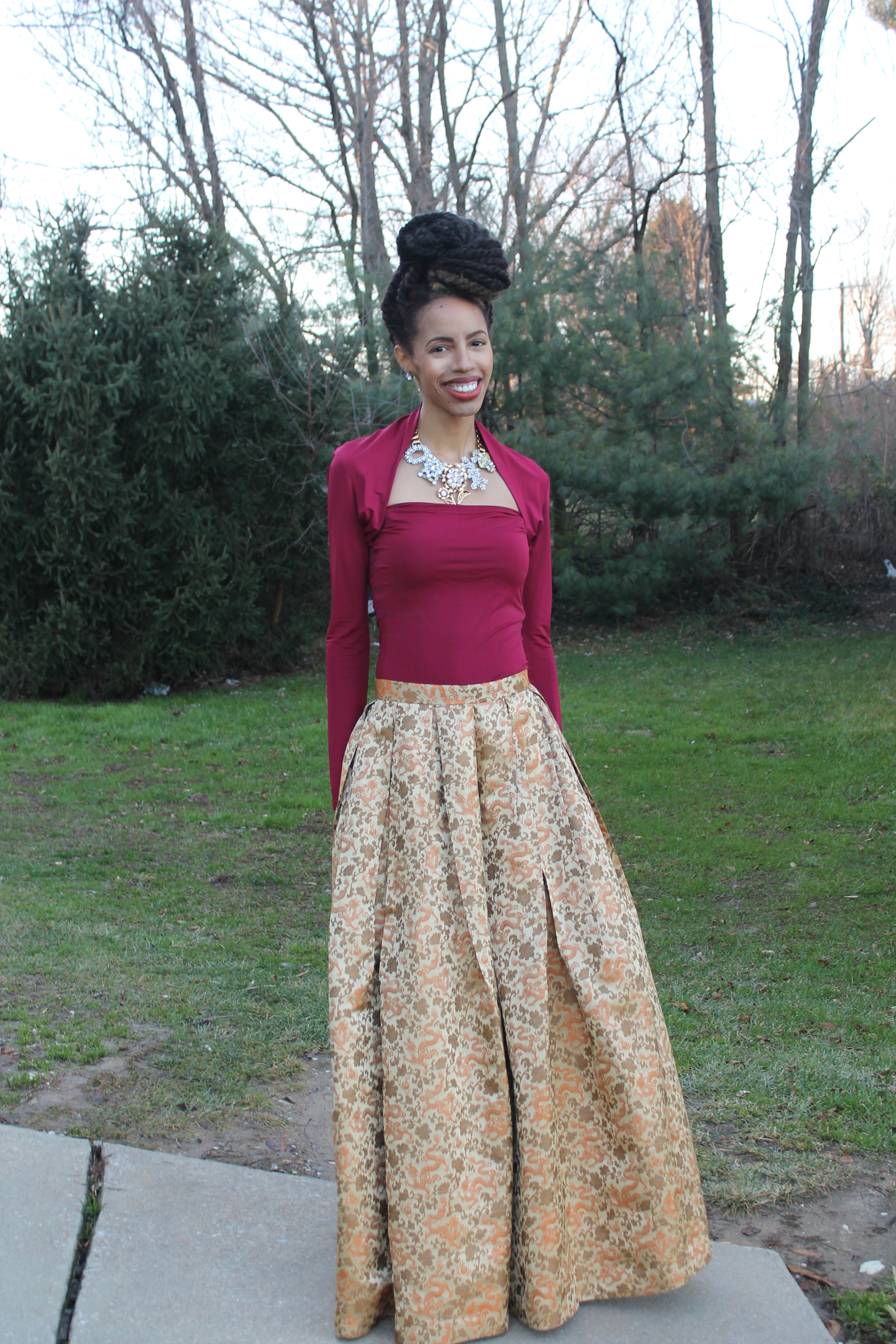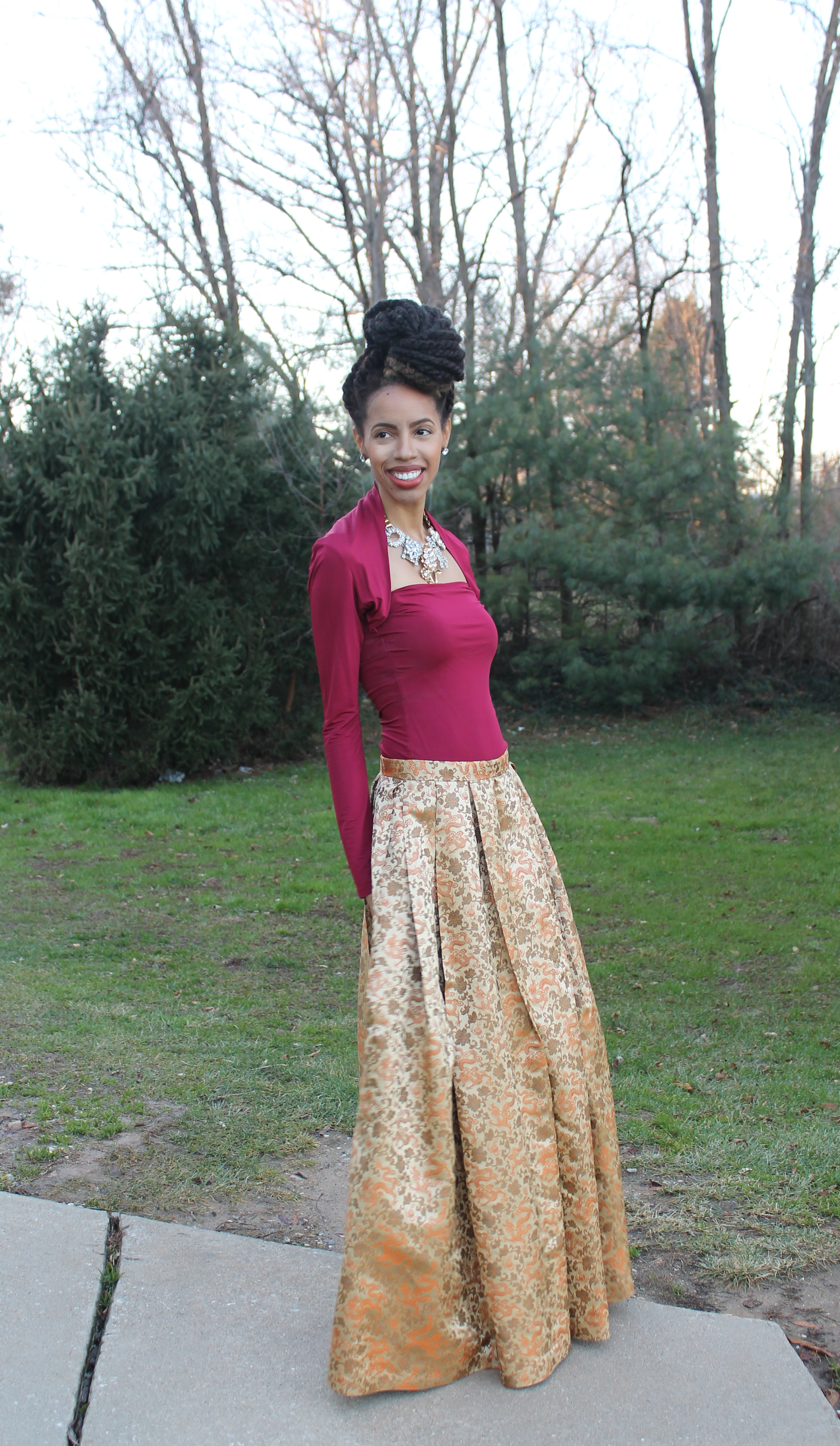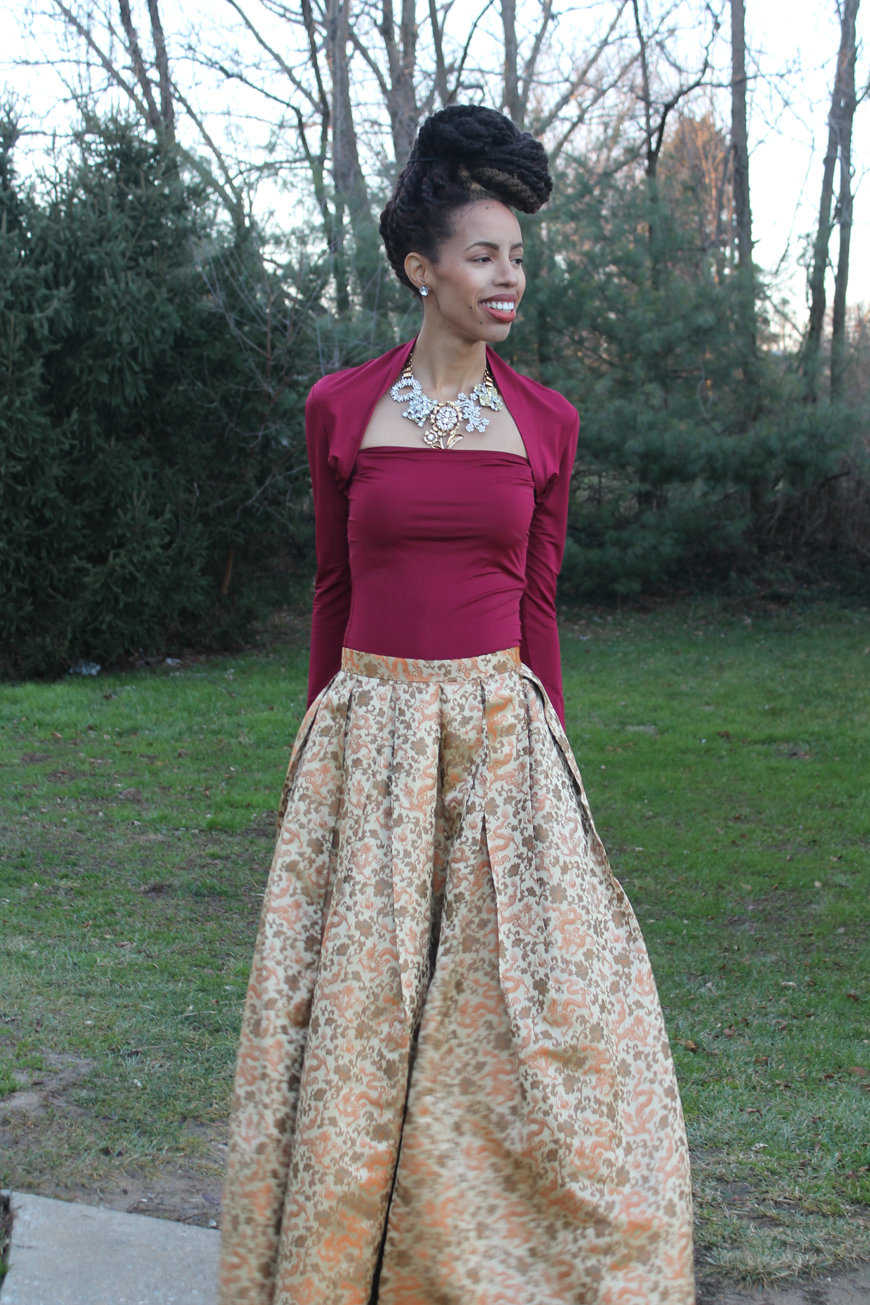 Wow this is so beautiful, it could almost be royalty! Your skirt is so pretty and I love your hair.