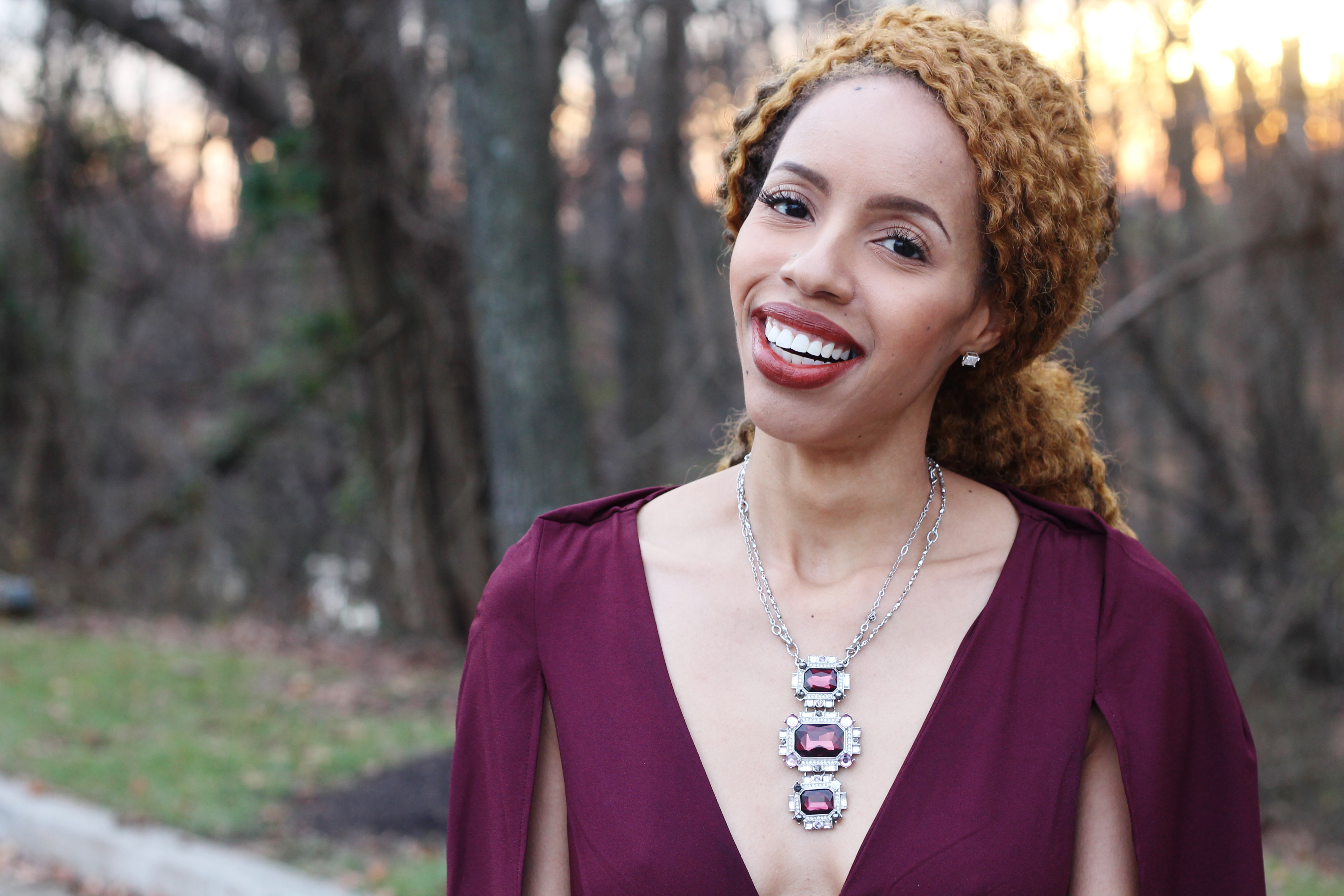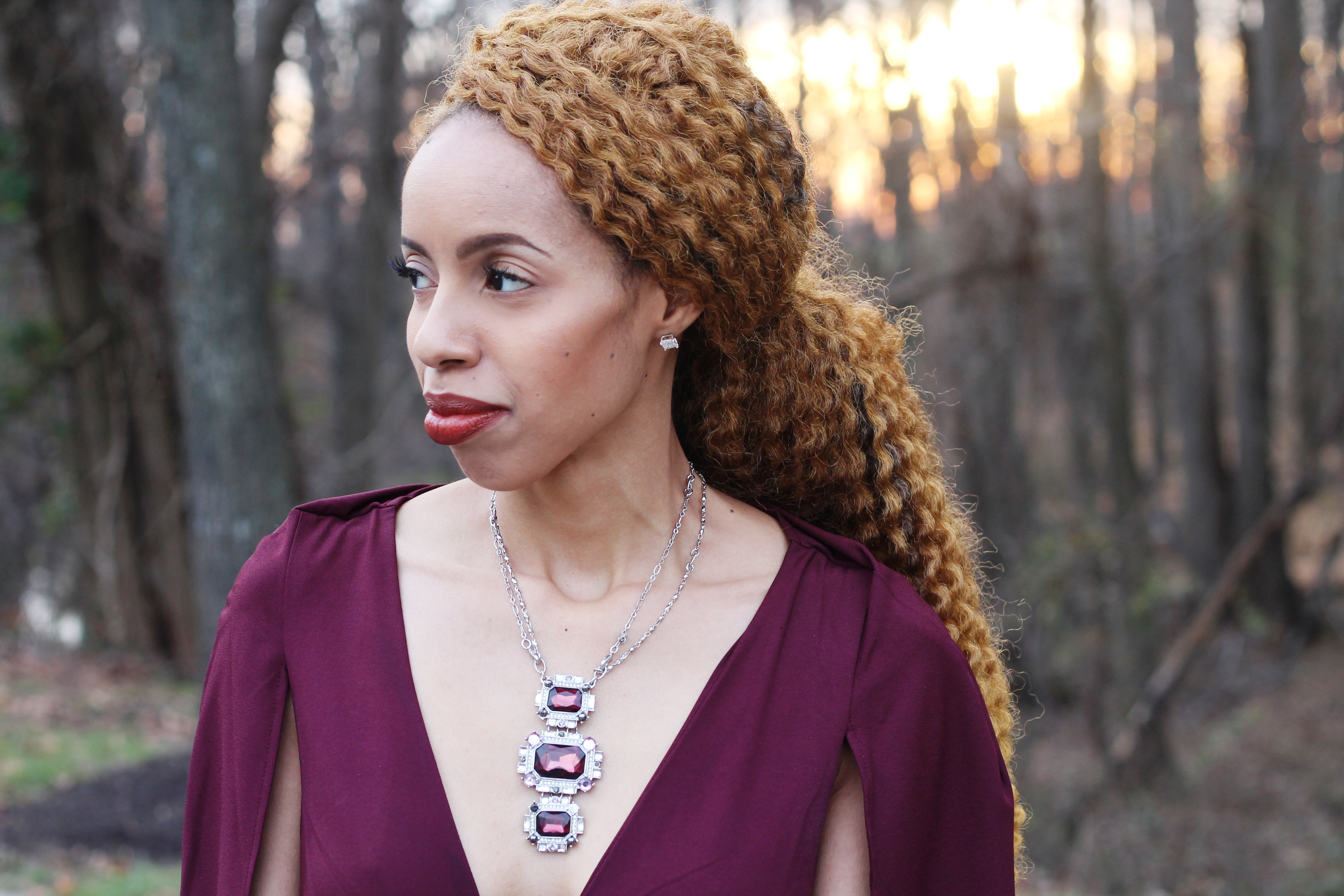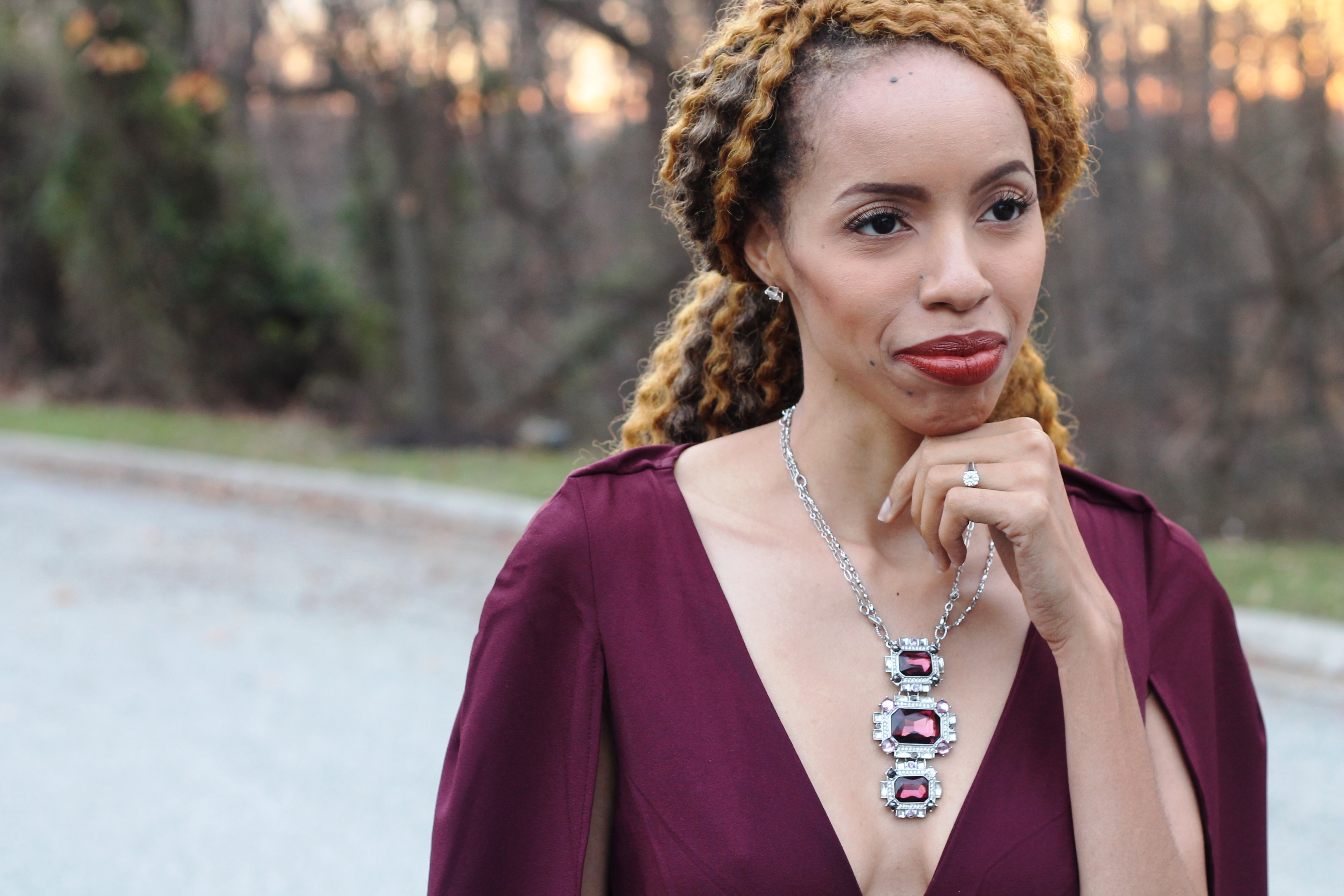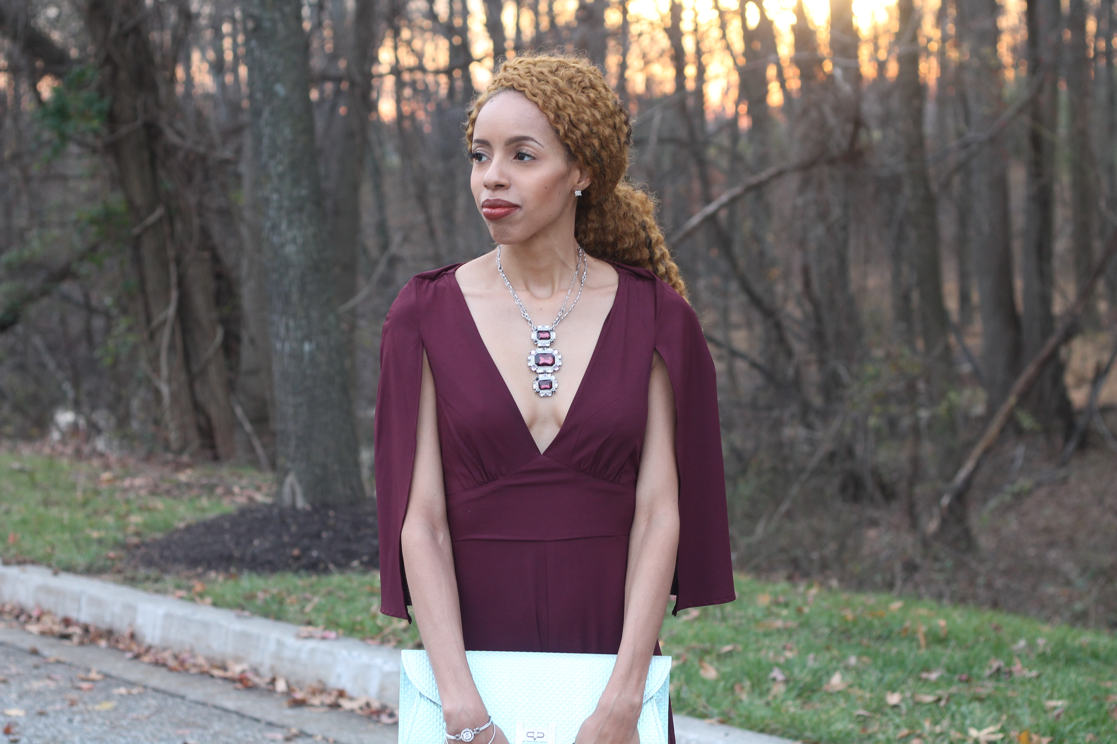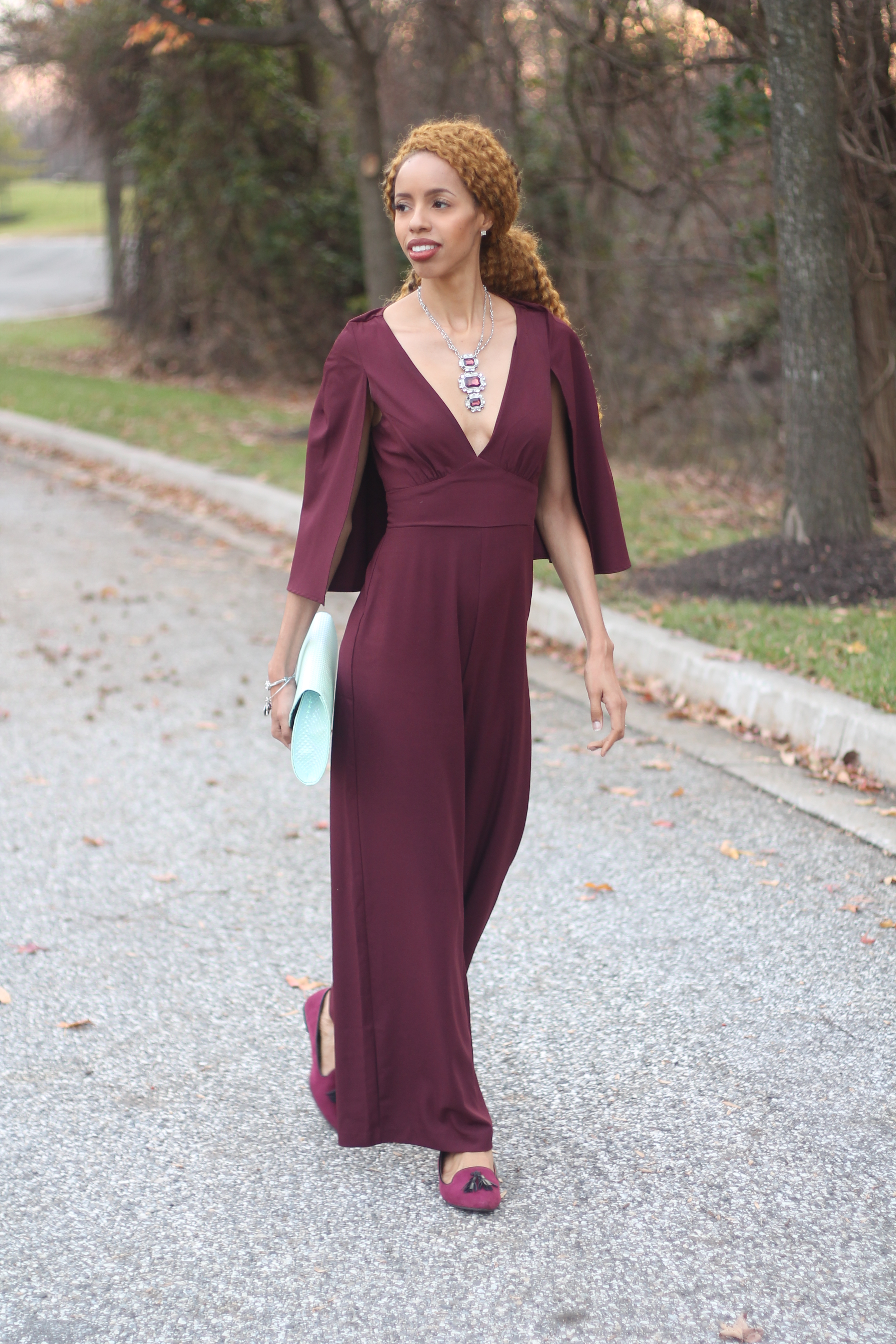 I believe I can fly and I can be fly… I certainly was in this ASOS cape jumpsuit! Wine, or deep burgundy, is the color of winter! I love this look of wearing wine from head to toe with a mint green, iridescent clutch. This trend setting look is very daring as the deep plunge in the neckline can offend some, lol. Either way, I am enjoying the cool (not cold) weather that I can enjoy this ensemble in.