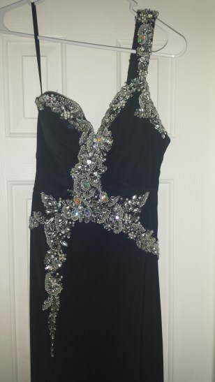 $100 + shipping. Black one-shoulder gown with slit and crystal/ AB stones. Size 4 (fits like a 2). Jersey material. Worn once for appearance.