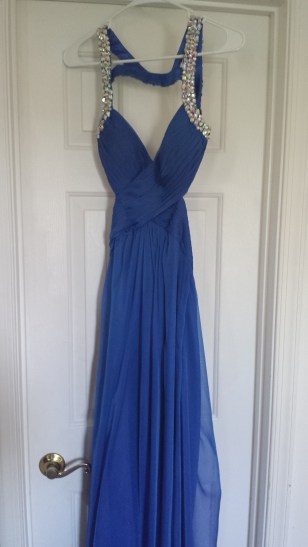 $40 + shipping. Royal blue gown with small tear in train. AB stones. Size 4. Can be easily turned into a cocktail dress. Worn once for appearance.