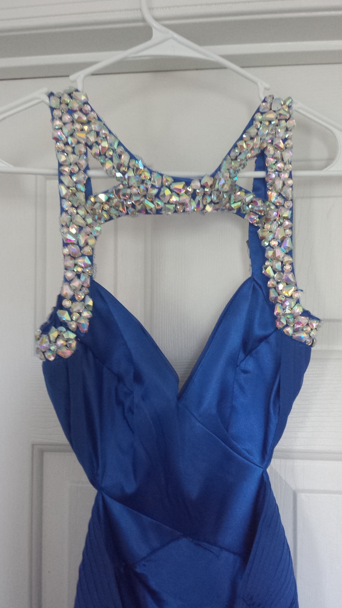 $40 + shipping. Royal blue gown with small tear in train. AB stones. Size 4. Can be easily turned into a cocktail dress. Worn once for appearance.