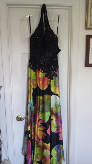 $150 + shipping. Black and floral Jovani gown with slit and stones on the entire gown (color stones added). Size 2. Worn twice for fashion wear and appearance. Won fashion at Galaxy nationals.