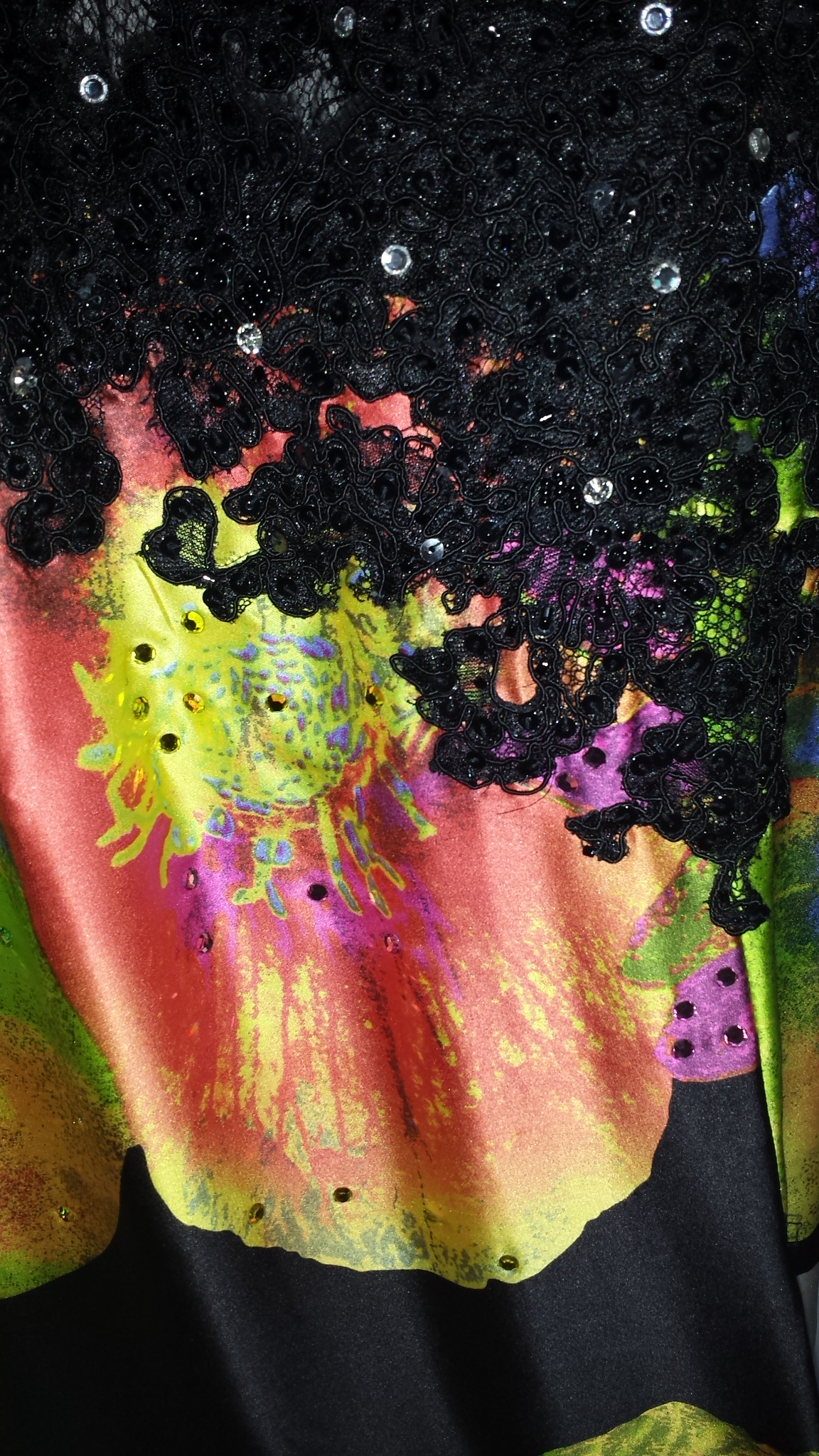 $150 + shipping. Black and floral Jovani gown with slit and stones on the entire gown (color stones added). Size 2. Worn twice for fashion wear and appearance. Won fashion at Galaxy nationals.